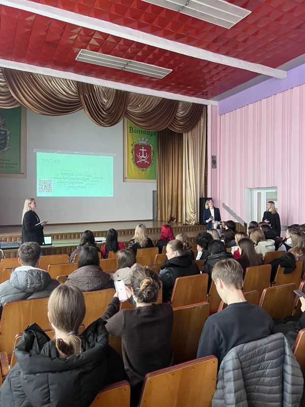 У ВСП “Вінницький торговельно-економічний фаховий коледж ДТЕУ” 23 жовтня 2025 року викладачі іноземної мови Телячук Н.В. та Бондарчук А.А. разом з волонтерами міжнародного комітету Ради студентського самоврядування Вінниччини Похилою Ольгою та Шкіндер Анною організували інтерактивну лекцію та Q&A session з представниками школи іноземних мов “Wizard School” на тему: “Education Without Borders”. На пізнавальну зустріч були запрошені студенти груп Ф-4, Ф-5, АП-1 спеціальності 035 “Філологія” та групи Ж-1 спеціальності С7 Журналістика.