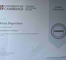 Студентка групи ФБС-16 ВСП «Вінницький торговельно-економічний фаховий коледж ДТЕУ» Аліна Погорілець під наставництвом наукового керівника Грищук Надії Вікторівни впродовж грудня місяця 2025 року, пройшла Міжнародне онлайн навчання University of Cambridge, яке має професійне визнання й підтримку професійної спільноти в усьому світі.