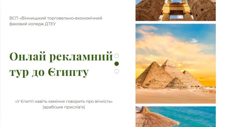 Студенти груп Т-11, Т-12 ВСП ВСП «Вінницький торговельно-економічний фаховий коледж ДТЕУ» під керівництвом викладачів Рябцевої А. М. та Дацюк Н. В. провели навчально-практичний воркшоп «Рекламний онлайн тур до Єгипту».