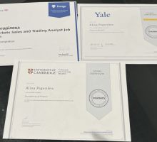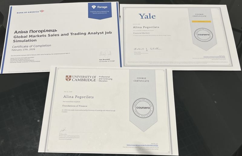 У професійному доробку студентки — сертифікати від легендарного Єльського університету (Yale University) за вивчення фінансових ринків (з відзнакою) та Кембриджського університету (University of Cambridge) у сфері основ фінансів. Окрім теоретичної бази, Аліна здобула неоціненний практичний досвід, пройшовши віртуальну програму аналітика від Bank of America.