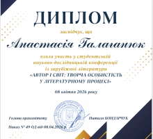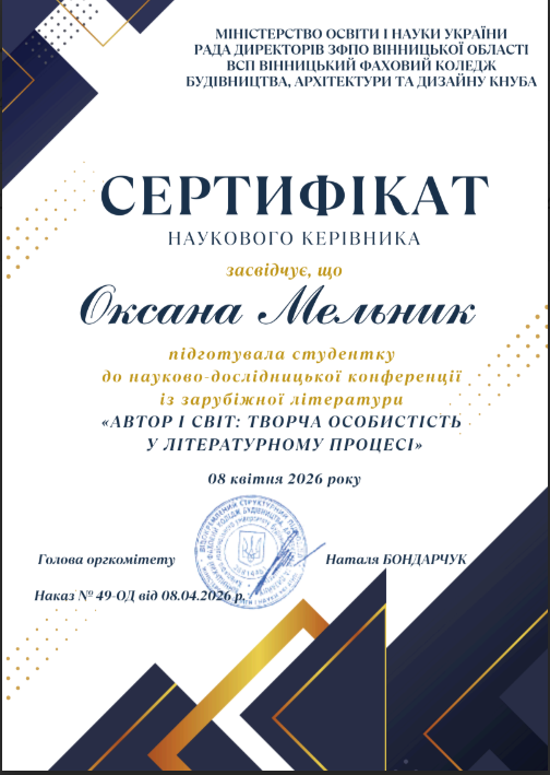 У рамках обласного методичного об’єднання викладачів зарубіжної літератури 08 квітня 2026 року студентка ВСП «Вінницький торговельно-економічний фаховий коледж ДТЕУ» Галаганюк Анастасія (група Ж-1) під керівництвом викладача Мельник О. В. взяла участь у студентській науково-пошуковій конференції «Автор і світ: творча особистість у літературному процесі» серед здобувачів фахової передвищої освіти Вінницької області, яка відбулася на базі ВСП «Вінницький фаховий коледж будівництва, архітектури та дизайну КНУБА». Здобувачка освіти гідно представила наш навчальний заклад з темою доповіді «Світоглядні домінанти Ромена Гарі крізь призму роману «Повітряні змії».