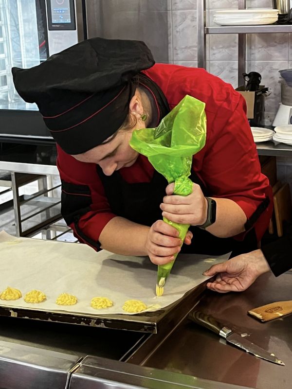 Олександр поділився власним шляхом у професії, розповів про досвід роботи на проєкті, а також продемонстрував сучасні техніки декорування та поєднання смаків. Студенти активно ставили запитання, цікавилися секретами успіху та отримали цінні поради щодо творчого розвитку в кулінарній сфері. Учасники майстеркласу мали можливість не лише спостерігати за професійною роботою кондитера, а й безпосередньо долучитися до процесу створення тістечок.