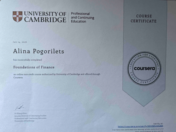 Використовуючи знанієвий капітал з корпоративних фінансів, банківських операцій, ринку фінансових послуг, оцінки інвестиційних проєктів та аналізу капіталу, студентка успішно виконала всі практичні кейси й фінальні завдання, чим продемонструвала високий рівень підготовки й навички аналізувати фінансову звітність, оцінювати рушійні сили зростання та бізнес-ризики, а також розуміння основ банківської справи, кредитування та фінансового планування, й 13.01.2026 р. отримала сертифікат за спеціалізацією «The Principles of Financial Leadership».
