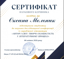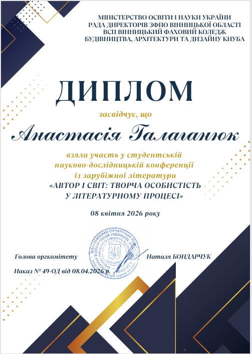 У рамках обласного методичного об’єднання викладачів зарубіжної літератури 08 квітня 2026 року студентка ВСП «Вінницький торговельно-економічний фаховий коледж ДТЕУ» Галаганюк Анастасія (група Ж-1) під керівництвом викладача Мельник О. В. взяла участь у студентській науково-пошуковій конференції «Автор і світ: творча особистість у літературному процесі» серед здобувачів фахової передвищої освіти Вінницької області, яка відбулася на базі ВСП «Вінницький фаховий коледж будівництва, архітектури та дизайну КНУБА». Здобувачка освіти гідно представила наш навчальний заклад з темою доповіді «Світоглядні домінанти Ромена Гарі крізь призму роману «Повітряні змії».